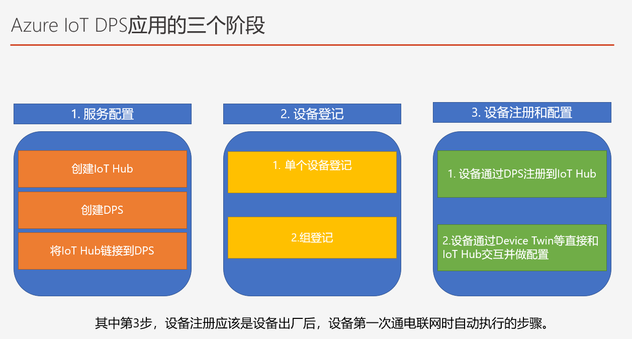 DPS可将设备实时预配到 IoT 中心(实际上就是验证设备身份,然后将设备按照规则注册到IoT Hub的过程),而无需人工干预。 成功预配后,设备会直接连接到指定的 IoT 中心。 此过程称为自动预配,